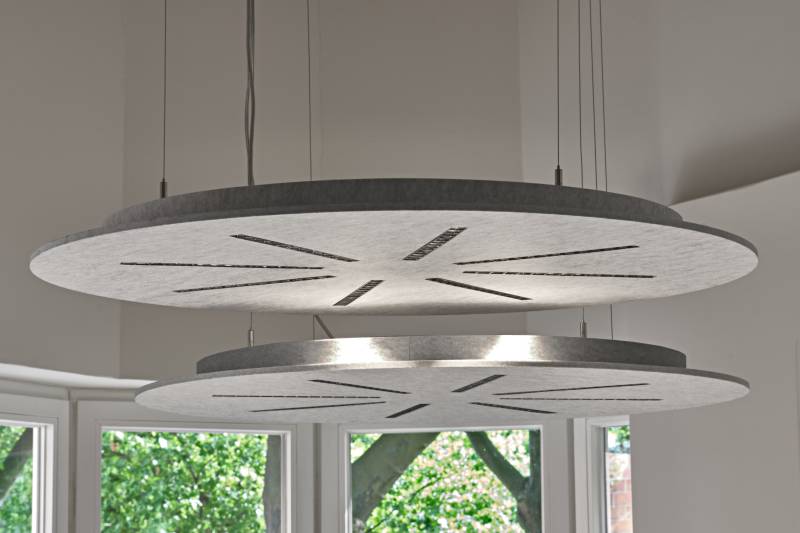 Glatte Decken, Wände, Fenster und Tische sind beliebt in der modernen Architektur. Leider bewirken diese Oberflächen starke akustische Reflexionen. Ein Innenraum mit z. B. Betonwänden kann viel Hall verursachen. Gefüllt mit Menschen entstehen eine Vielzahl nachhallender Echos. Diese Störgeräusche können bei Besprechungen zu Irritation und Ablenkung führen. Die Kombination aus Licht und akustischem Absorber ermöglicht oro diesen Effekten entgegenzuwirken. Frei von der Decke kann die kreisrunde Leuchte mitten über den Störquellen im Raum höchste akustische Leistung erzielen. Einzeln oder im Verbund lässt sich oro in unterschiedlichen Kombinationen aufhängen.