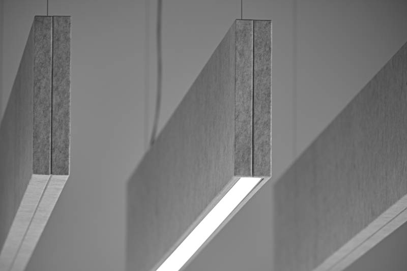 Akustikausleuchtung für den einzigartigen Einsatz. Durch die unterschiedlichen Längen der Baffel, lassen sich die verschiedensten Innenräume frei gestalten. Gerade bei sehr glatten Böden und Wänden profitiert der Raum von einem akustischen Gegengewicht mit maximaler Oberfläche. So lassen sich Hall und Echos optimal abfangen und dem Raum ein angenehmes Klangbild verleihen. Durch die integrierte Beleuchtung sind zwei wichtige Komponenten in einem vereint. Ruhe und Licht bei schmaler Bauform.