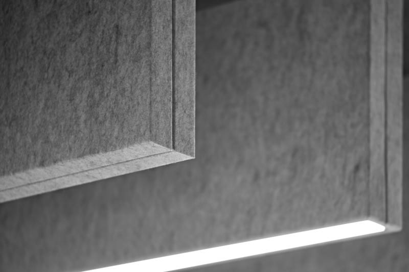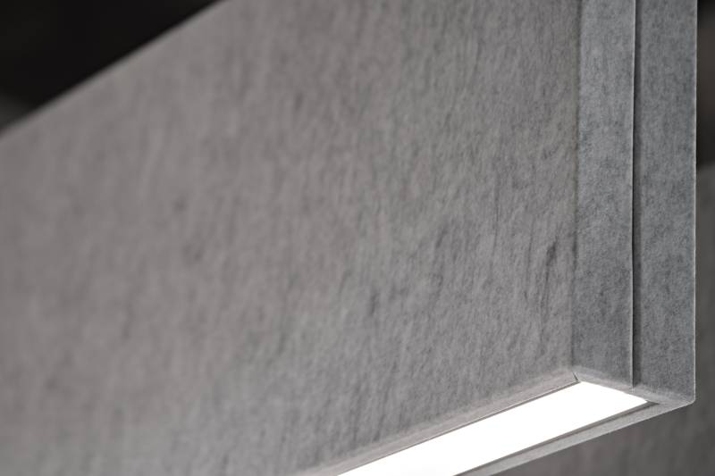 Wegen der großen Oberflächenstruktur des Filzkörpers aus hochwertigem Nitona® werden Schallwellen auf dem Weg durch den Raum optimal absorbiert. Die Leucht-Baffel ist identisch mit der reinen Akustik-Baffel. Die zusätzlichen Hochleistungs-LEDs von Dular® schließen bündig mit der Unterkante ab.